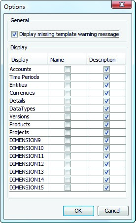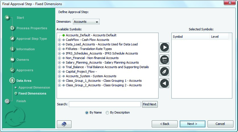 - For Display, for symbols in the various dimensions of your database, specify whether you want the approval process to display their symbol name, symbol description, or both.