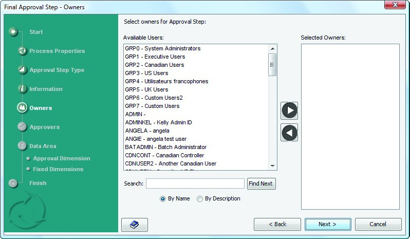 - When you are finished, click Next. The Approvers dialog of the wizard appears.