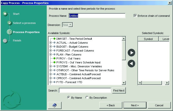 - For the Available Symbols list, select the Time Period symbols for this process, and click the arrow keys to move them to the Selected Symbols list. When you select time period symbols, you must select all levels.