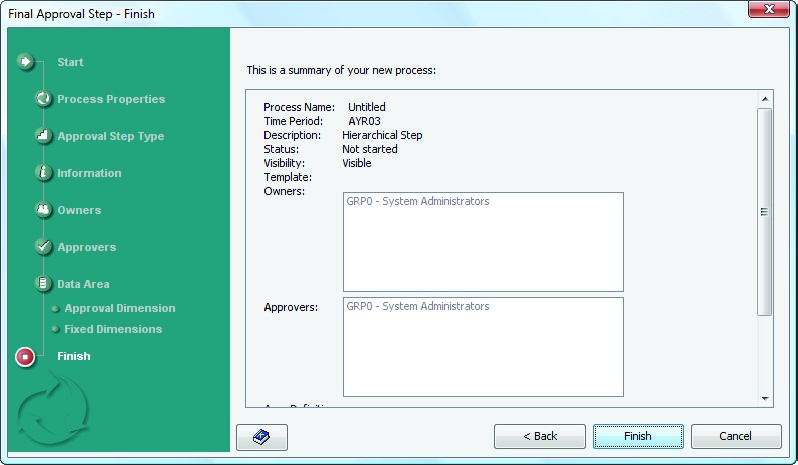 A Hierarchical approval step represents multiple Data Areas defined by a hierarchy in a dimension (often ENTITIES).