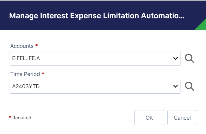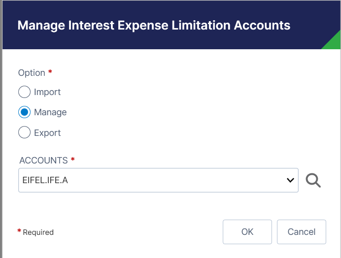 Interest Expense Limitation accounts can be calculated instead of being manually entered or imported. The Manage Interest Expense Limitation Automations feature allows you to configure accounts to be calculated using source data from your trial balance or tax provision results.