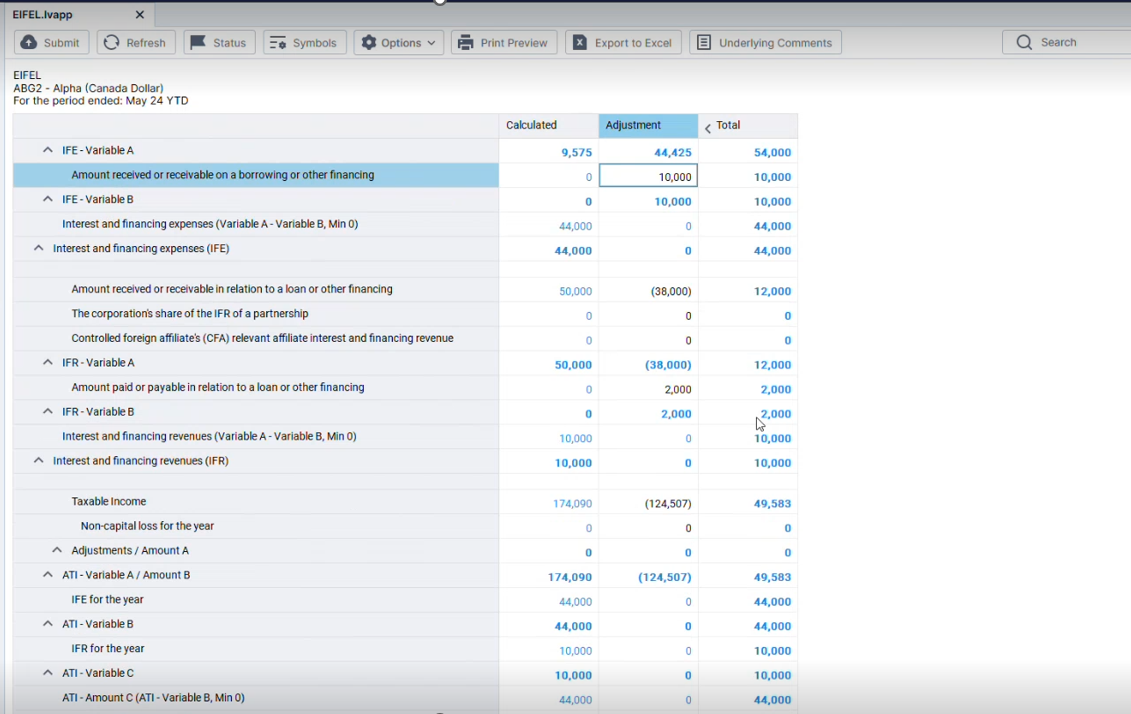 | EIFEL.ATI.AMT | Adjusted taxable income (ATI) (Amount B + Amount C - Amount D, Min 0) | = Max(0, Sum(EIFEL.ATI.A, EIFEL.ATI.AMT.C, -1 * EIFEL.ATI.AMT.D)) |